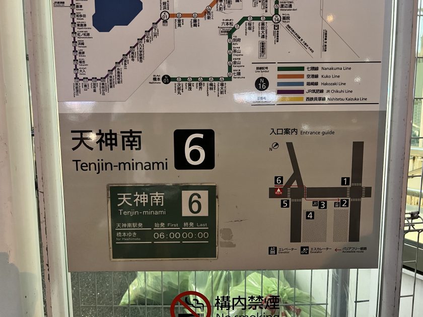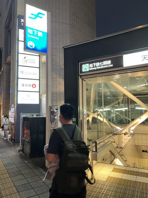 2. หากเดินทางด้วยรถไฟสายสีเขียว [Nanakuma Line] สามารถลงที่สถานี Tenjin-minami [N16] ทางออก 6 ได้ ซึ่งทางออกนี้ เปิดให้ใช้บริการตั้งแต่ 06.00 – 00.00 เดินไปประมาณ 5 – 8 นาที ก็ถึงโรงแรม