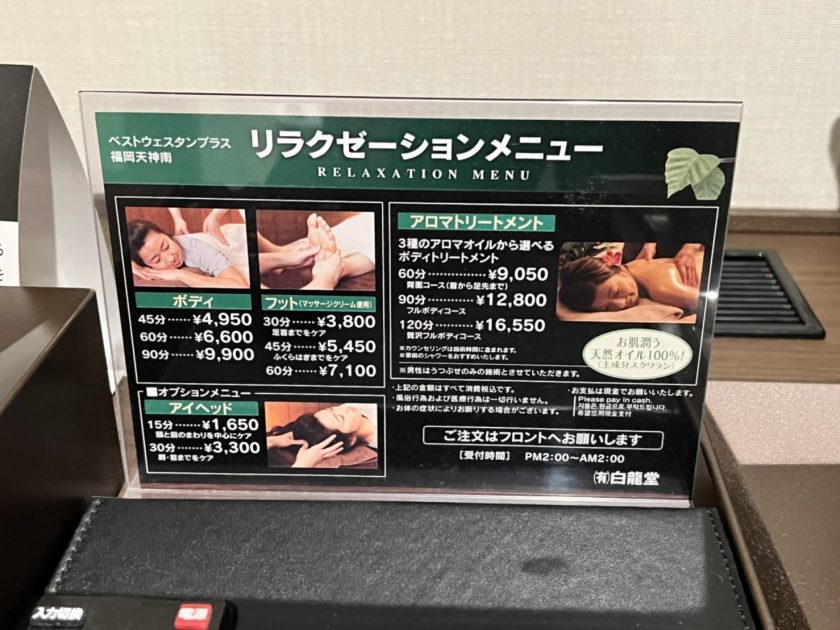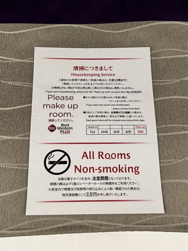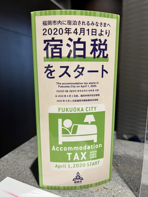 วันที่เช็คอิน ทางโรงแรมจะมีการเรียกเก็บค่าภาษีโรงแรม จำนวน 200 Yen/ห้อง ซึ่งเป็นกฎที่ทางเมืองฟุกุโอกะเริ่มเก็บค่าภาษีนี้กับนักท่องเที่ยว 1 เมษายน 2020 เป็นต้นไป