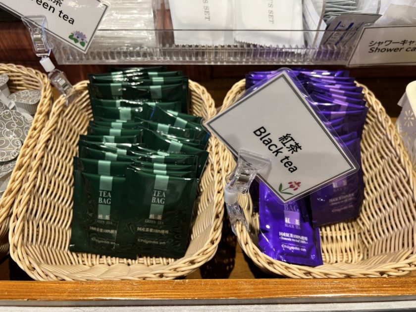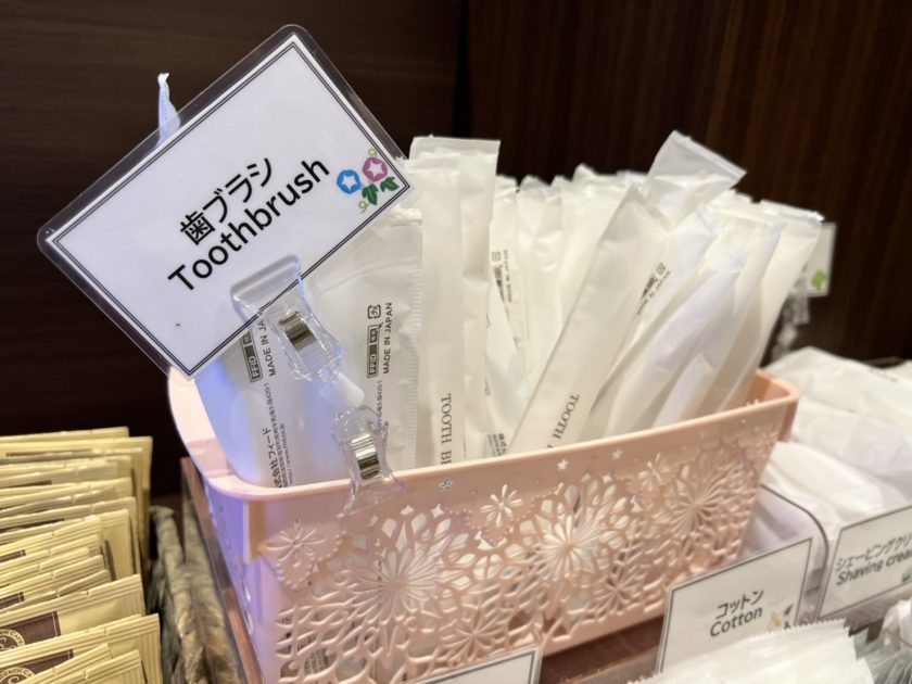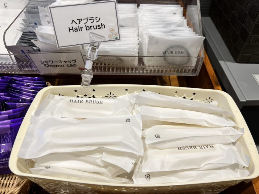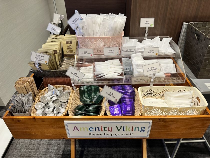 บริเวณโซน Lobby จะมีอุปกรณ์ amenity ที่ใส่ในตระกร้า จัดเตรียมให้ในโซนเดียวกัน ทางผู้เข้าพักสามารถหยิบเองได้เลย ซึ่งโดยปกติแล้ว แทบจะทุกโรงแรมในญี่ปุ่นจะเป็นแบบนี้ ดังนั้นพวก Amenity ต่างๆ ไม่ว่าจะเป็นแปรงสีฟัน มีดโกน สำลี เป็นต้น ทางเราสามารถหยิบเองได้ตามสะดวก สำหรับคนไทย บอกได้เลยว่า ยิ้มเลยครับ ที่โรงแรมจะมีพวกา กาแฟให้ด้วยนะ หยิบได้ตามสบายเลย
